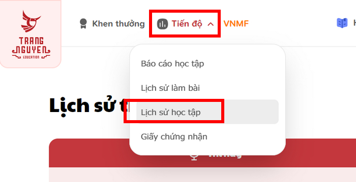 Bước 4: Chọn Tiến độ => Chọn tiếp Lịch sử học tập
